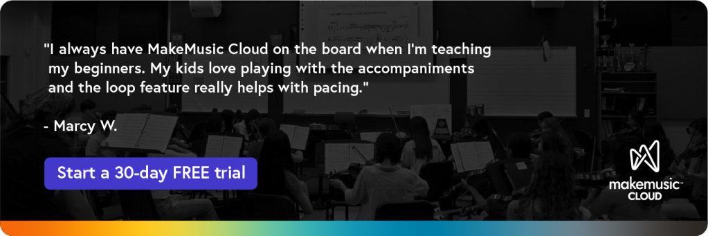 We move to the mallet parts and will often double or triple up on the xylophone or marimba for the sake of learning the music. We spend a lot of time working in small and slow chunks with MakeMusic Cloud’s looping feature before running the entire selection. The older students will often be assigned tuba, bassoon, and baritone parts to play on marimba to expand their comfort with bass clef and diversify the mallet assignments.