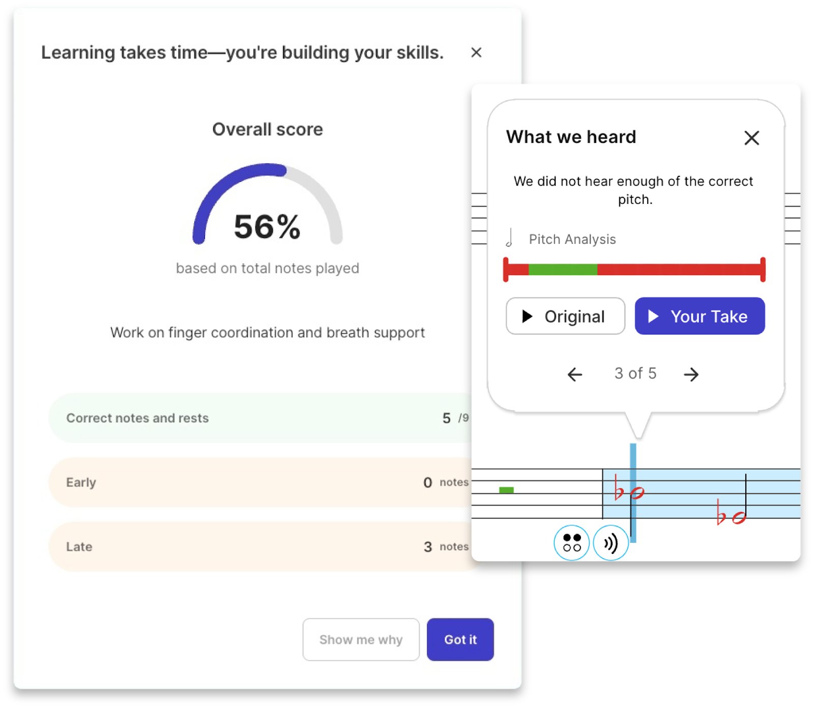To fix this, we’ve completely revamped the way we provide practice feedback with more detailed, actionable information so students know exactly what to work on before the next class. This includes early/late note timing breakdowns, note-by-note accuracy analysis, and encouraging recommendations for improvement.