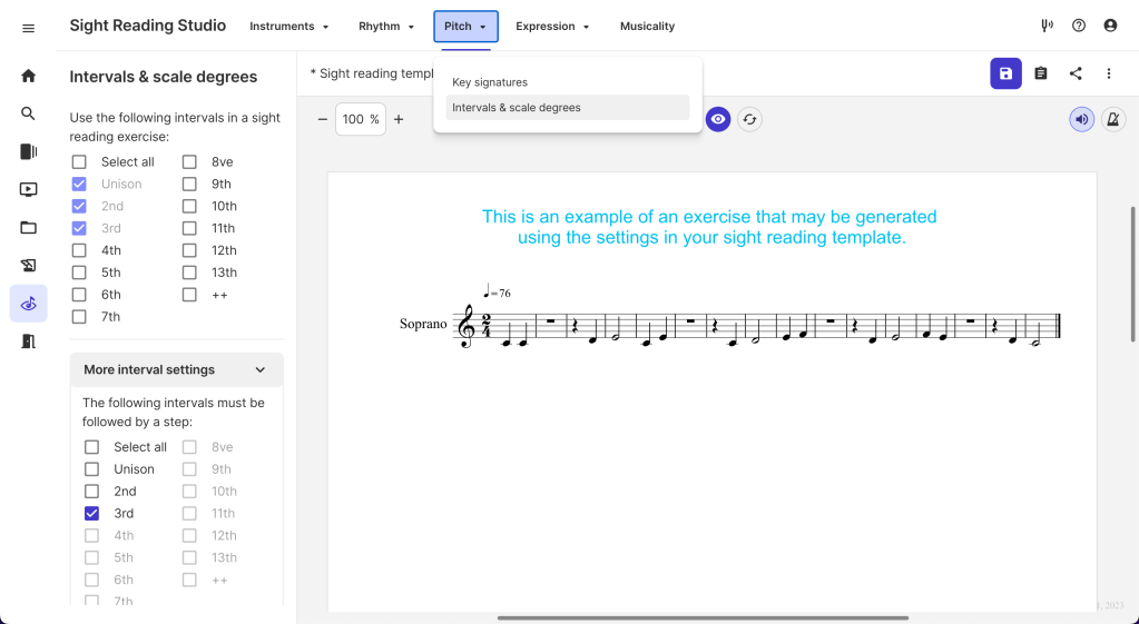 When creating a sight reading template, you have extensive control of the intervals and scale degrees that appear in the generated music. You can select all or remove the intervals that you would like to have appear, set the maximum interval following intervals of a specified width, and choose which scale degrees will be used. Please note that you are not currently able to disable intervals of a unison, 2nd, and 3rd. This ensures that Sight Reading Studio always generates music that sounds like real music.