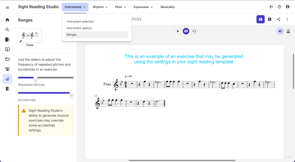In the Ranges settings in the Instruments menu, you can modify the number of repeated pitches and accidentals in an exercise. Simply drag the sliders to change the settings to your desired output.