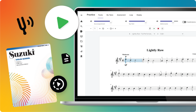 A MakeMusic Cloud subscription includes more than just Suzuki accompaniments. Access Sound Innovations, etudes, solo literature, and more to help students develop technical skills alongside their Suzuki training. Students can play back their performances and loop difficult sections for repetition.